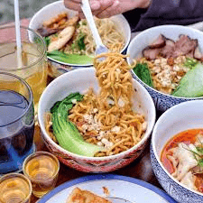 • Mi kering: Mi direbus lalu dicampur saus khas, biasanya lebih ringan tapi kaya rasa.
